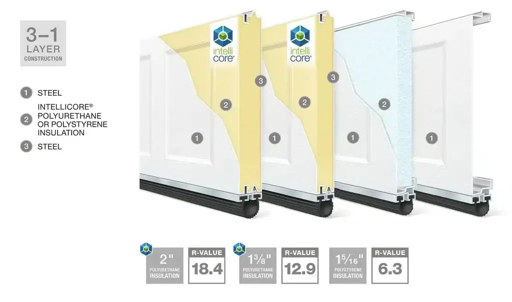 - Insulated door R-values range from 6.3 to 18.4.