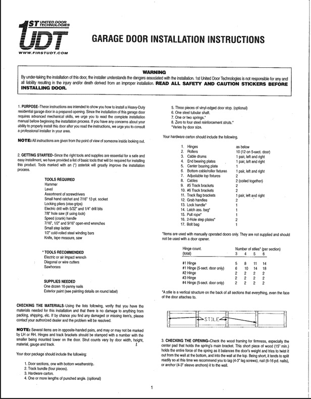 First United Door Technologies, LLC warrants, to the original owner, the door section(s) for LIFETIME against the defects where splitting, cracking, peeling, or deterioration due to rusting through, from the original date of installation by persons authorized by 1stUDT. If, during this period, the door sections are found to be defective upon inspection by an authorized 1stUDT representative, 1stUDT will repair or replace, at its option, the defective section(s). This warranty covers the door sections only and does not apply to other parts of the garage door or operating hardware.